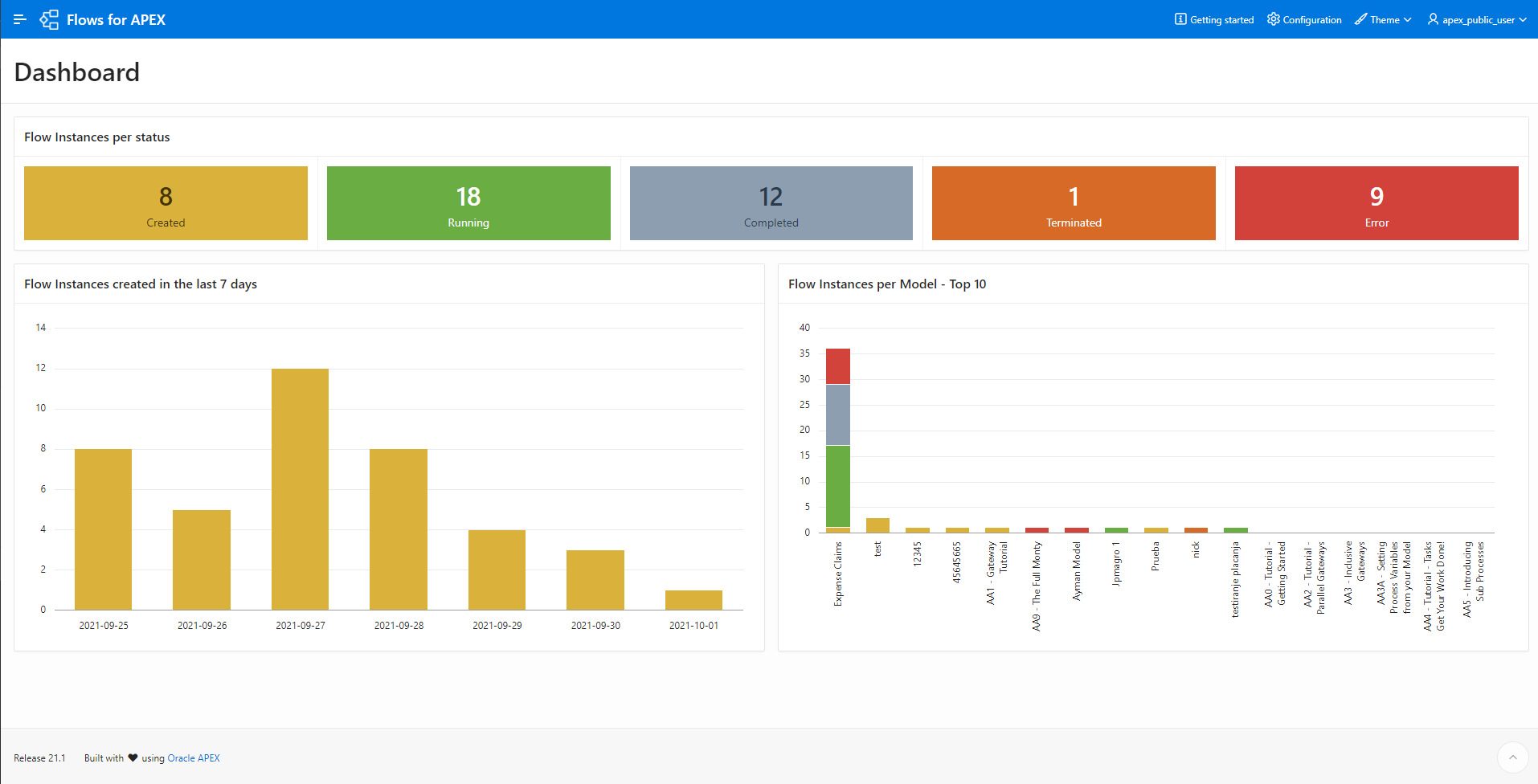 Flows for APEX is a powerful workflow engine extension for Oracle APEX applications. Model your business processes with BPMN, develop your process steps in APEX, and monitor your running processes with the Flows for APEX application. Flows for APEX was created as a community project by team of experienced APEX professionals to meet the workflow requirements in many APEX applications.